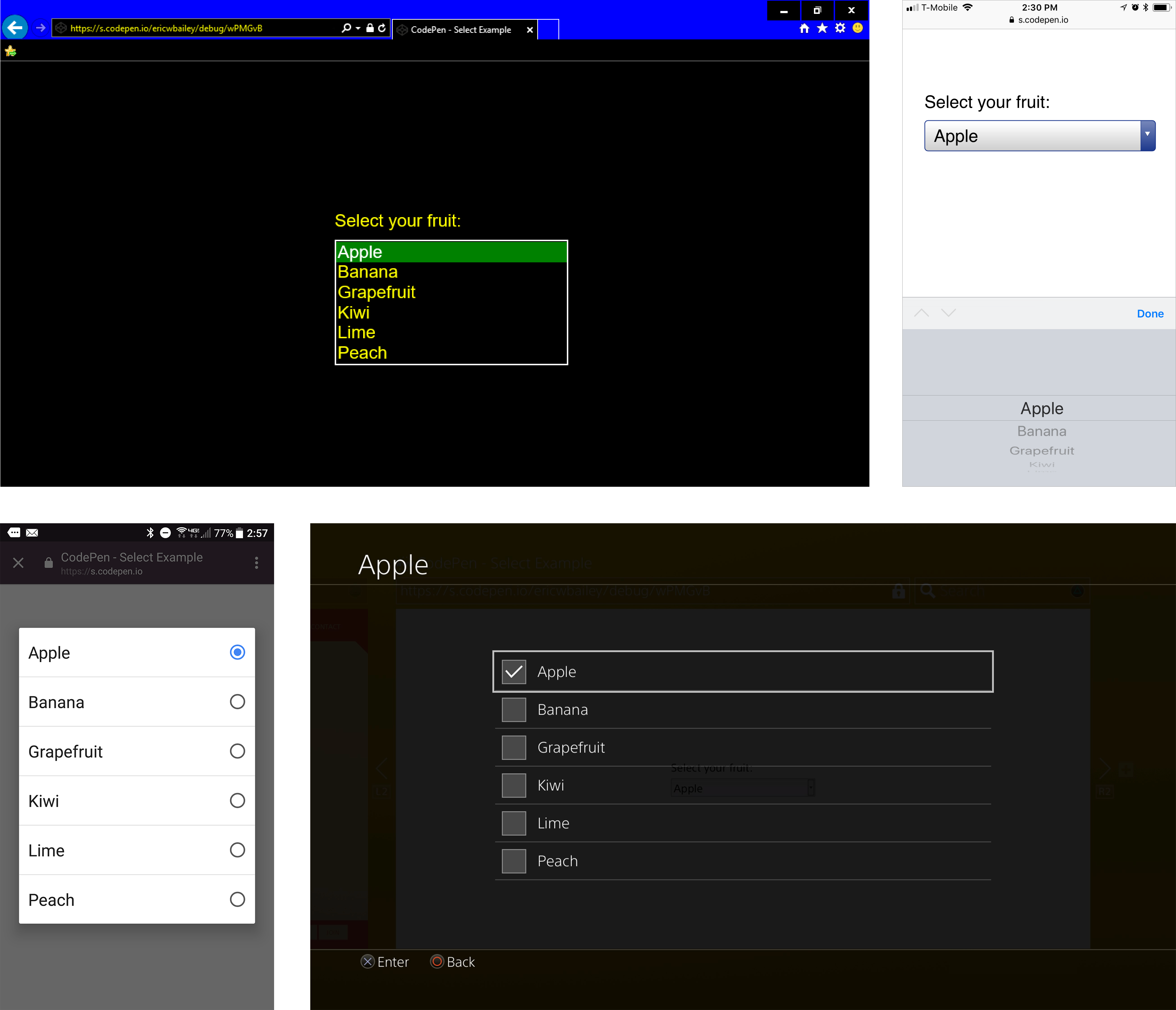 Screenshots of Internet Explorer, iOS Safari, Playstation 4, and Android Oreo all displaying active select menus. Each presentation is slightly different, reflecting the capabilities of each operating system.