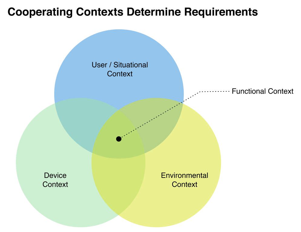 All together, these three contexts help to define the functional context for the application. The functional context is the definitive set of concerns and tasks that need to be addressed for that user or user group. When combined with your business strategy for reaching that segment, the overall experience should come into view.